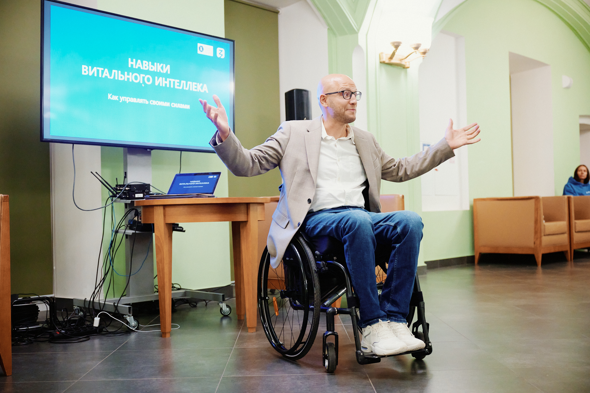 Открыл обсуждение Дмитрий Чешев, пловец-параатлет, спикер TEDx. Он рассказал о теории множественного интеллекта, сделав особый акцент на развитии витального интеллекта. Спикер на личном опыте продемонстрировал, что навыки сохранения энергии являются ключом к достижению поставленных целей. Дмитрий Чешев обсудил вместе со студентами долгосрочную мотивацию для проведения научных исследований: ее лучше строить на положительных эмоциях, основная из которых — удовольствие от самого процесса создания нового знания.